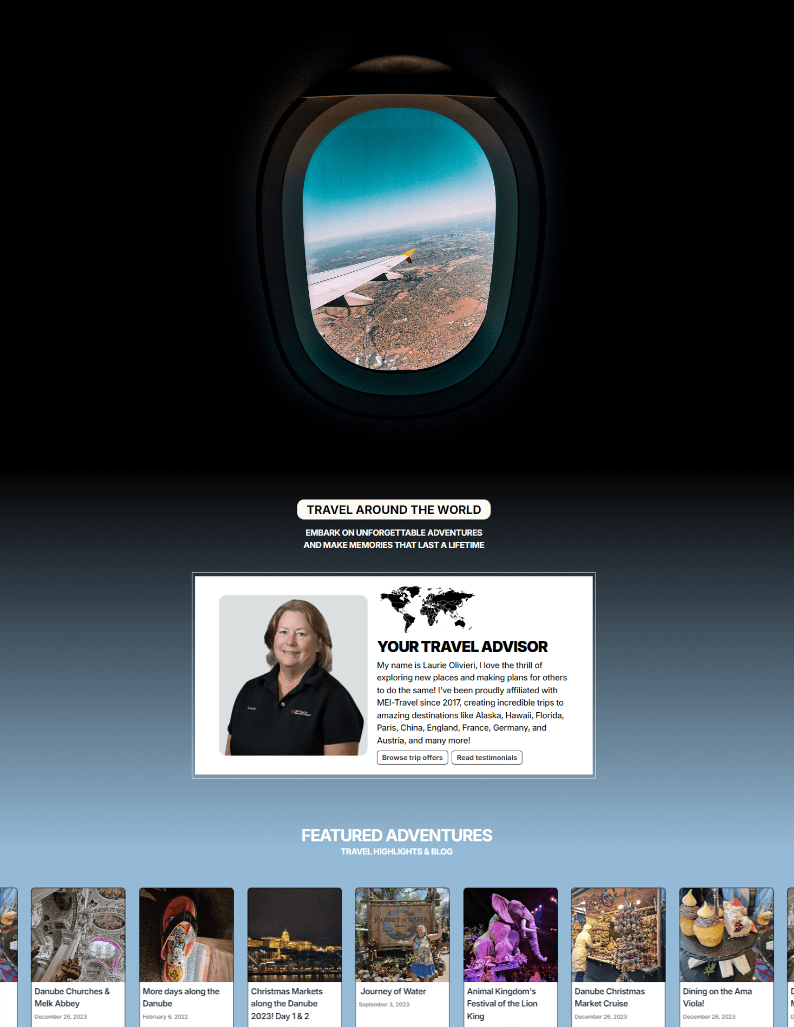 In order to enhance the aesthetics of Laurie's website, I chose to implement a parallax effect in the hero section, creating a visual illustration of zooming out from an airplane window. This strategy is aimed at sparking the visitor's wanderlust and introducing the idea of travelling. I then built a user-friendly blog CMS for Laurie. This would allow her to keep her site content updated, despite her admitting to not being a very tech savvy person.